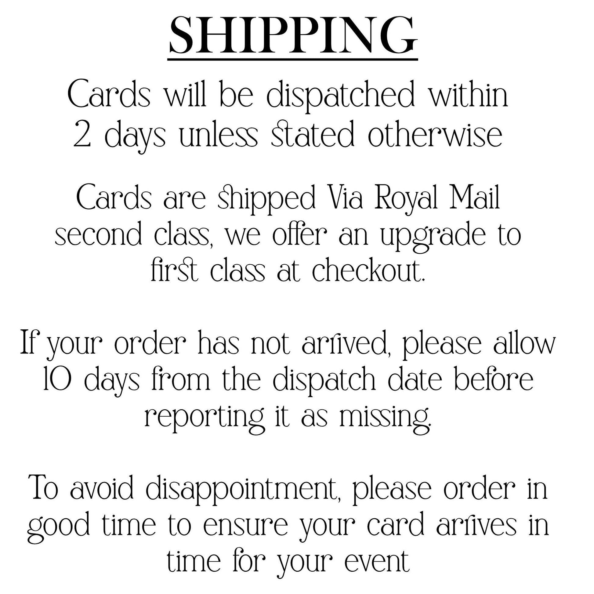 All orders are dispatched via Royal Mail second class post, delivery estimations provide only a rough idea of your item's potential arrival time. Please bear in mind that unforeseen delays, beyond our control, may occur. We offer various delivery choices, including standard, tracked, and next working day options (please note that these do not encompass the time needed for order printing and packing). Should we become aware of any postal delays, we will promptly update our shop announcement.