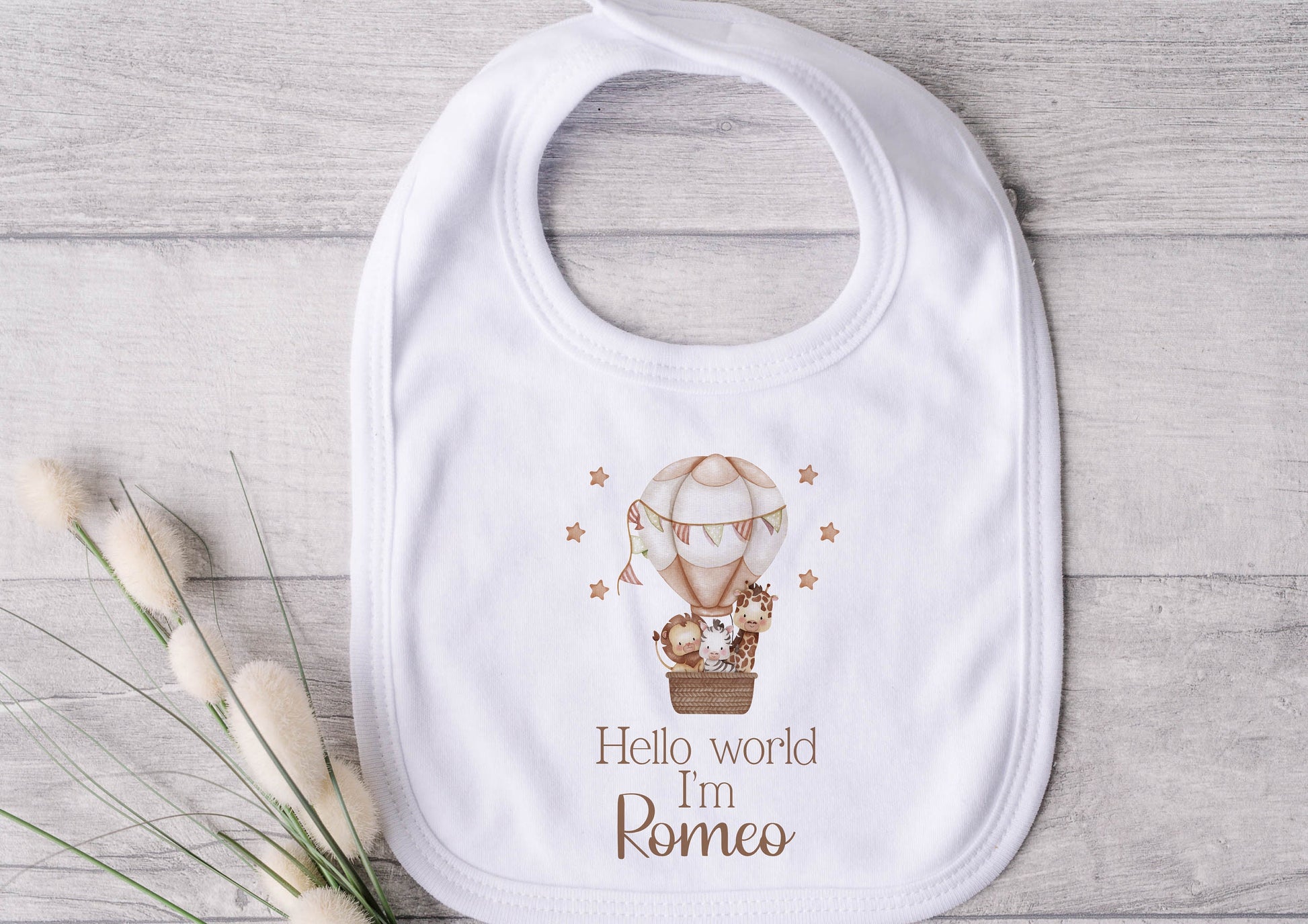 Personalised Hello World Baby Gift Set, Sleepsuit, Vest & Bib