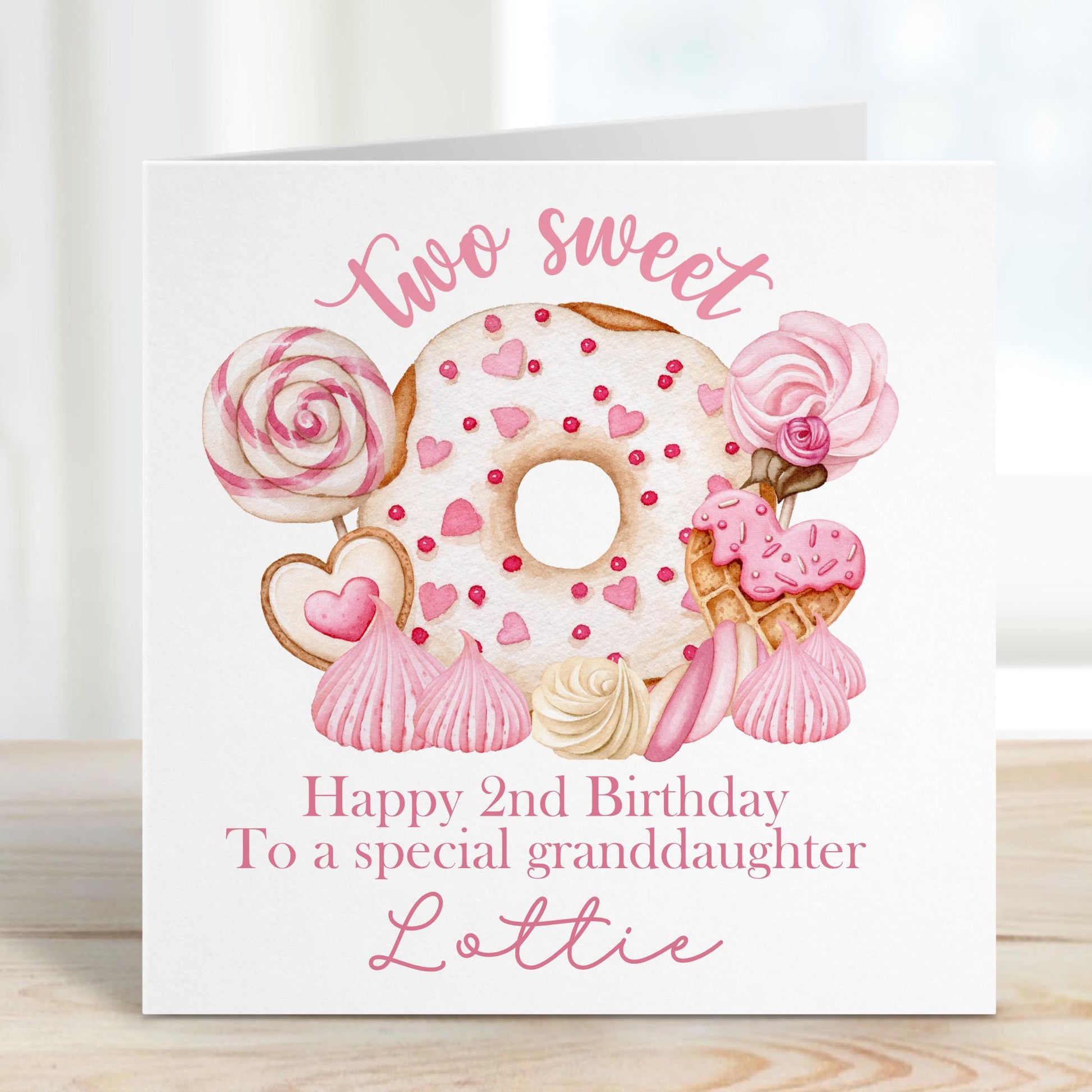 Personalised Sweet 2nd Birthday Card for Girls – Candy and Doughnut Design, Daughter or Granddaughter
